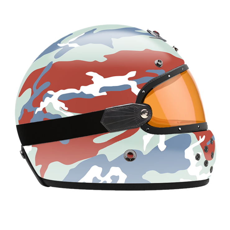 Our full face helmet offers even more safety than the open face helmet. Specifically built without a fixed visor, the full face helmet is predestined for use with glasses or goggles. Nevertheless, we also offer a range of beautiful visors in clear, light smoke, dark smoke and orange specifically for the full face helmet, trimmed with leather and attached to a rubber strap, that fits perfectly with the shape of the full face helmet. The leather visor can be attached to the full face helmet with a snap on the backside of the helmet to maintain a secure fit (separately available, see accessories).