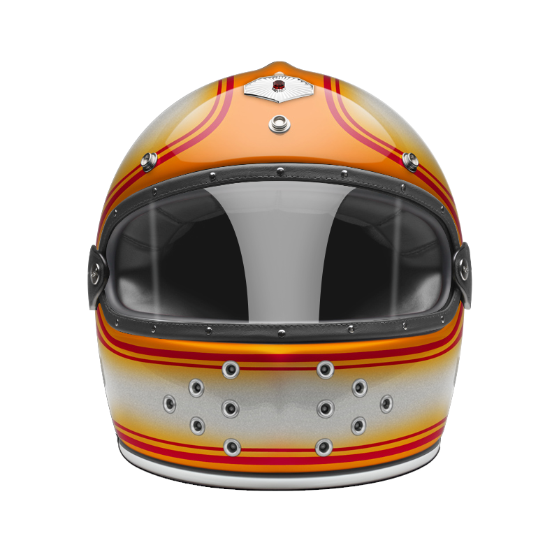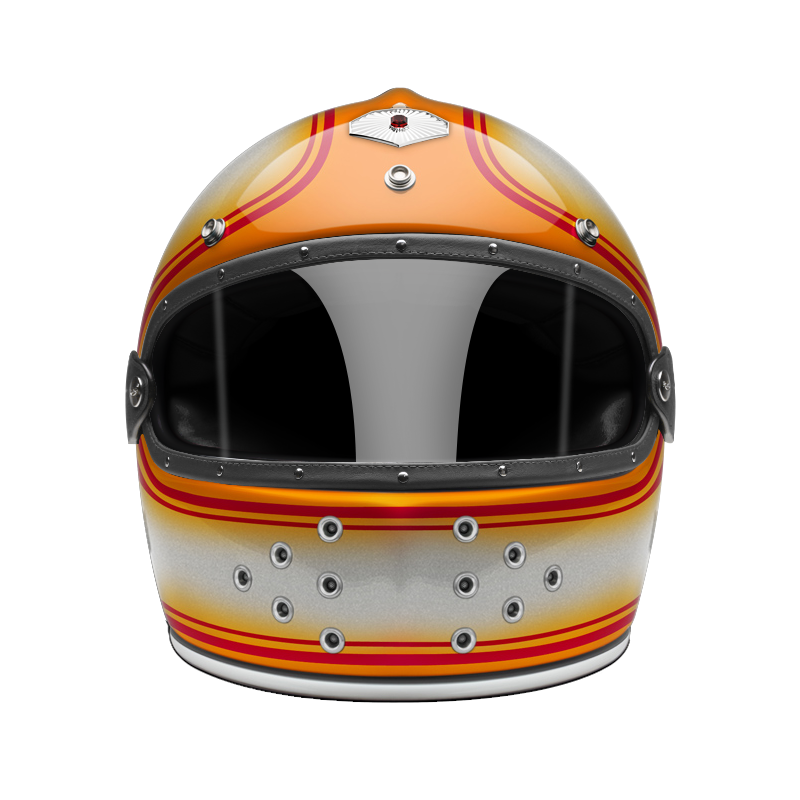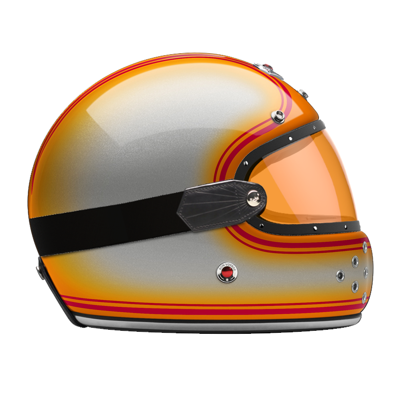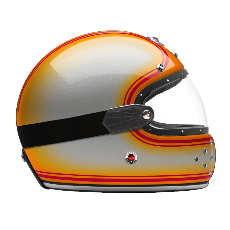 Our full face helmet offers even more safety than the open face helmet. Specifically built without a fixed visor, the full face helmet is predestined for use with glasses or goggles. Nevertheless, we also offer a range of beautiful visors in clear, light smoke, dark smoke and orange specifically for the full face helmet, trimmed with leather and attached to a rubber strap, that fits perfectly with the shape of the full face helmet. The leather visor can be attached to the full face helmet with a snap on the backside of the helmet to maintain a secure fit (separately available, see accessories).