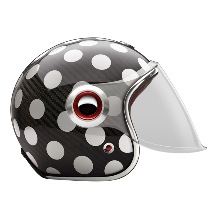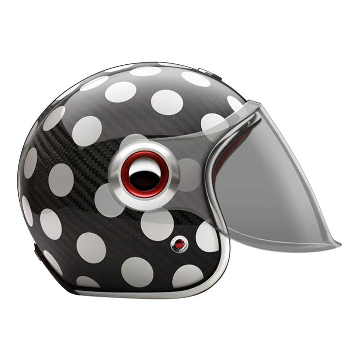 The large, integrated screen gives the helmet a subtle retro-futuristic character, echoing 1960s robots and science-fiction heroes, while remaining compact on the head. Each helmet combines a vintage-inspired silhouette with modern materials and current safety standards.